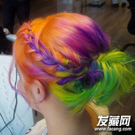 浅粉色太小清新,那我们可以试试深色系列挑染的头发,从头顶编一个细小的发辫,让粉色和紫色相溶于大面积的橘色头发中。
