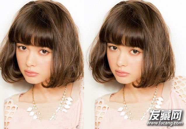 深棕色与中短发烫发的完美碰撞,一款时尚的内扣中短发与甜美的平刘海搭配起来,不仅时尚而且显露出个性与时尚的一面来。