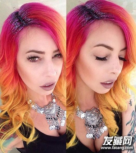 所谓彩色发根就是将彩色的装饰小亮片或彩色粉末用发蜡涂抹在发根处,通常会选择覆盖在头发分界线上重点突出,比较醒目。这种彩色发根挺有节日气息,所以平时各种节日party弄一个,既新意又好看。小编还觉得梳着去郊游阳光小清新,效果一定不错,去夜店high也够个性,如果不考虑清洗问题,倒是一个解救无聊发型的绝佳方法!