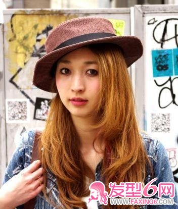 可爱的牛仔风长发,重点在于没有头帘的中卷度长发,搭配上不规则形的牛仔帽。亮点就是将一边的头发塞到耳后,而牛仔帽也很随性的斜戴。