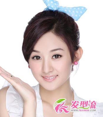 韩式盘发造型打造出立体的五官,斜刘海显现出精致的脸型。蓝色圆点蝴蝶结点缀在发型,为造型提升了甜美度。