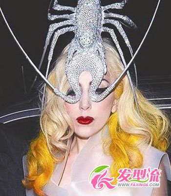 中长卷发挑染成鲜黄色,格外抢眼。头顶巨型的龙虾发饰,龙须从鼻翼直冲上空,如同恶魔界的女王,更是吸引众人的眼球。
