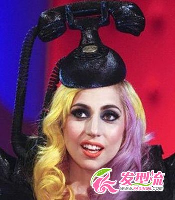 Gaga总是创意无限,连古董电话座机也能弄成发饰戴在头上。而同样亮眼的是那半黄半紫的卷发,突显张扬的个性美。
