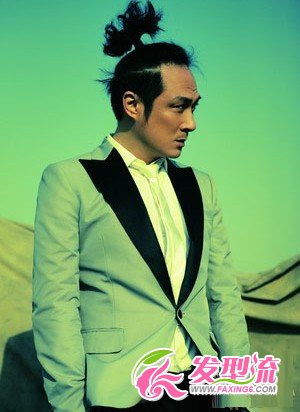 后扎成一个朝天小马尾,复古时尚!搭配一款经典的西服,将吴镇宇完美的身材展现了出来!