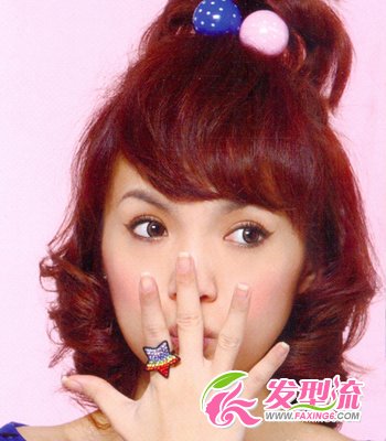 抓出要扎绑成公主头的发束,两侧的头发不要绑起,比较自然。直接用可爱的大发饰扎绑固定,绑好发饰后,从中央向外放射状拉开发丝,使之呈花朵形状。利用大而抢眼的发饰,直接绑成高高的冲天炮,因为是短发,所以看起来会很俏皮。