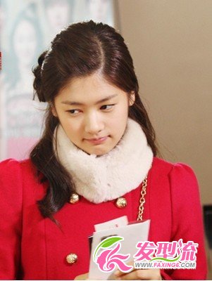 将后面发丝扎出发髻,右侧发丝上同样也扎出造型再利用发饰做点缀,搭配红色大衣,让你在人群中很是抢眼。