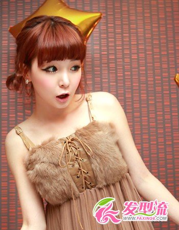 将长卷发随意拧绕盘在头顶,发尾方向放置前额刘海,与刘海形成的略微凌乱极具蓬松感。着重眼部部分,加深黑色眼线和睫毛长度。从侧面看,让五官更加精致,扑闪的卷翘睫毛如芭比娃娃般可爱。搭配系脖黑色长裙,颈间纱质部分隐约显露出性感诱惑。