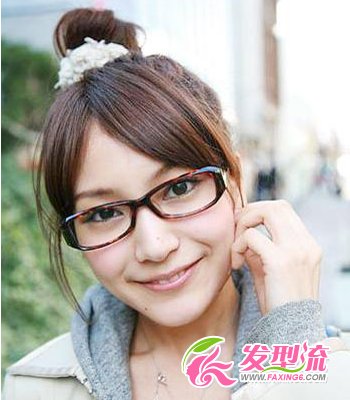 学生丸子头 学生风十足的丸子头,头顶随意梳起,自然又清爽。搭配可爱的米白色发饰,令这个发型增色不少。中分刘海带出几分甜美,复古渐变框眼镜看起来斯文大方,充满浓郁的学生风。