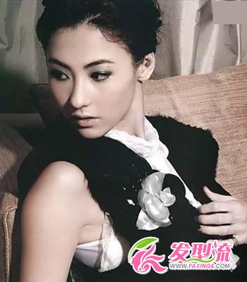长长的烫发,显得很妩媚,营造出些许凌乱却又很有层次感。发色乌黑自然,刘海全部梳起,尽显其惊艳的面容。