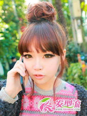 齐刘海与修脸的发丝突出精致的脸型,可爱的日系发型感觉。如果发量不够多的话,利用假发花苞头也是可以的啊,更方便呢。