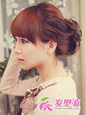 花苞头位于正脑后,搭配柔顺的齐刘海很有少女的感觉。发髻扎好后,拉出一些短小的发丝,花苞更显立体层次。