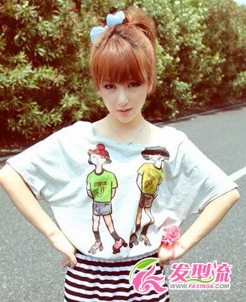 发型重点齐刘海,漂亮的发色,卷卷的小花苞,配上可爱的花朵发饰,淑女中平添些可爱的气息。