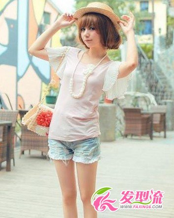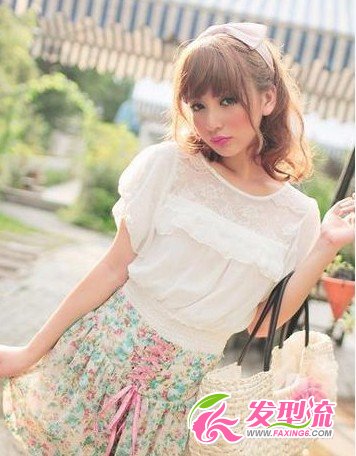 蝴蝶结发带给原本单调乏味的卷发平添趣味,两边鬓发掩饰脸型缺点,发色有点娃娃的感觉。