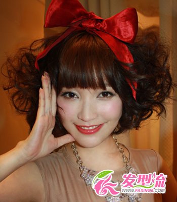 爆炸式的卷发不是很多人愿意尝试啊,如果脸型不是太精致的MM还是建议慎重选择。红色的缎带在头顶扎出蝴蝶结形状,很是俏皮可爱。