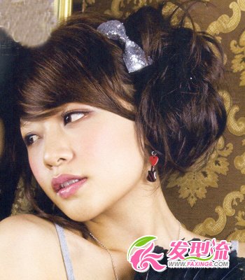 将头发从发根向发梢吹蓬松,制造空间感。将刘海偏分,剩余头发向脑后的一侧束起。束起头发向一个方向拧成发包,用发卡固定。在发卡固定处佩戴可爱的蝴蝶结小发卡。闪亮蝴蝶结搭配一侧散落的头发,平添性感韵味。就算带上面具也会成为焦点,随意且不性感的穿着与发型体现了超凡脱俗的高贵气质。