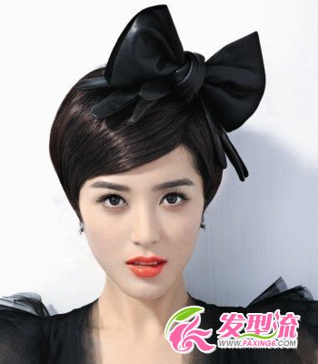 赫本风的复古短发造型,利用蝴蝶结做装饰和橘色唇妆很有旧时代电影的欧美风,利用同色系蝴蝶结做装饰,让造型加倍升级。