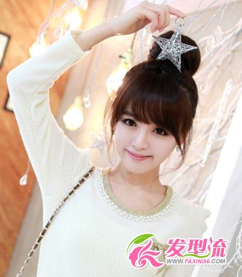 保留刘海,将所有发丝聚拢后高高扎在头顶,扎出丸子发髻。丸子头不应该扎得过于紧实,在扎发完成后,可以利用尖尾梳稍稍拢空丸子,让发髻更显蓬松感。齐刘海是卖萌女生必备,额际垂落的发丝更显小女生柔美气息。