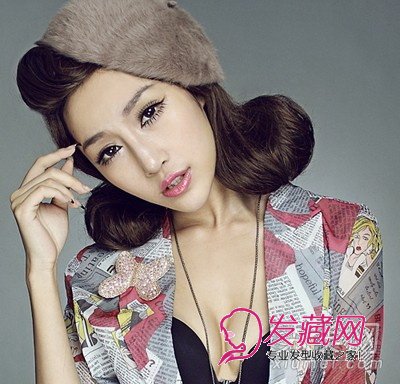 复古华丽的发型,将发尾打造成两个很有份量感的花苞,上面的刘海同样做成卷曲的造型,搭配一顶深色系帽子,散发淡淡的奢华气息。