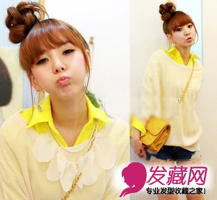 特别适合中长发的小妞们,将头发在头顶高高束起,编成松松的辫子后挽成小丸子发髻,能让造型更显清爽明快,同时让你看上去更俏丽年轻。为了突出春季的新鲜感,大胆尝试亮眼颜色的服饰单品,亮黄衬衫外配半透明针织毛衣,活力十足!