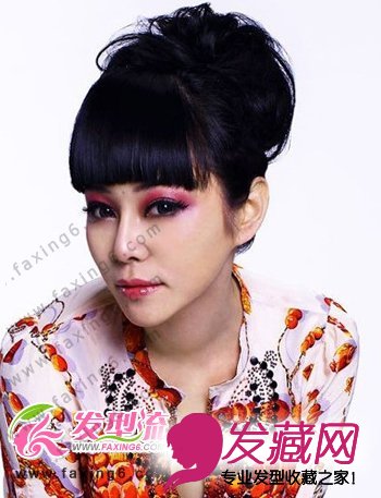 高高扎起的丸子头清爽干净,丸子头制造出蓬松感,更显自然大方,齐刘海的造型凸显出精致的五官,加入一个妖艳的眼妆,性感妩媚气息彰显的淋漓尽致,特别引人注目。