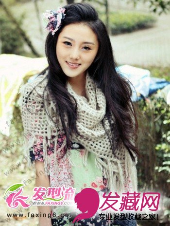 长长的卷发发型随性的披散在肩上,无比优雅甜美,自然黑色的发色让女生更显清纯自然,有着小颜美女气质,无刘海的打造,一张清秀可人的脸庞释放着无穷的清新感,清新怡人。精美发饰的点缀,甜美感十足。