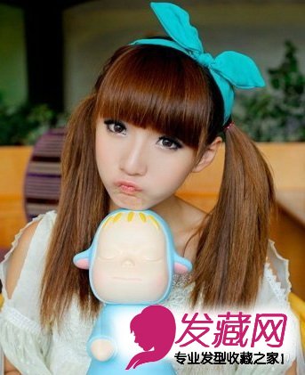 发型简单的扎成两个可爱的马尾发,乖巧可爱,十分的夺人眼球,平整的齐刘海搭配蓝色的蝴蝶结发箍,精美可爱,气质迷人。