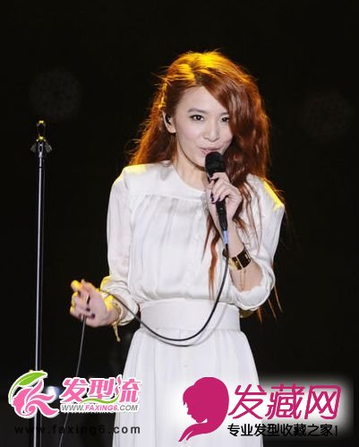 ,金棕色的发色在亮眼的镁光灯下,透着亮眼的光泽,长长的刘海加上夸张的麦穗卷烫发效果,遮住了一边的脸颊,Hebe全身散发着性感的神秘感。