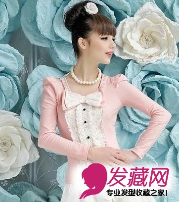 在头顶处扎一个圆圆的丸子头,女生的长发塑造了这款丸子头饱满的形状,额头整齐的平刘海以及粉嫩的服饰搭配,使女生显露高贵的公主气质。