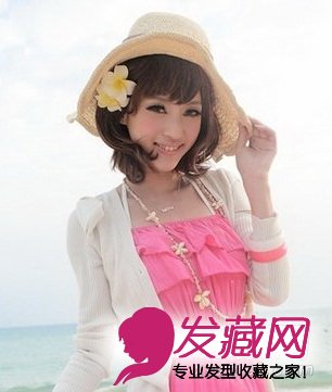 一款带着大海宽广气质的女生波波头,发尾为卷发的发型设计,特别凸显女生甜美的气质,刘海微微倾斜的修剪,以及耳边一朵小黄花的修饰,时尚的竹编帽子,带给我们女孩小清新的范儿。