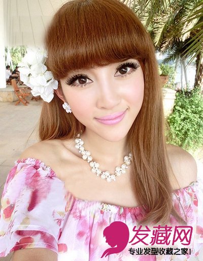 闪电的大眼睛很有秒杀性,披肩的微卷发,柔和甜美,厚重的齐刘海,粉嫩减龄,奶茶系的染发萌萌惹人爱。侧边插上一朵新鲜花饰个性浪漫海边度假风情味道十足拟!