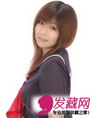 这款栗色中长发发型给人有些时尚的感觉,四六分的斜刘海微微露出额头拉长了脸型,蓬松头顶发丝充满光泽,柔顺中长发发丝轻盈感十足,整个中长发发型配上女大学生一身宝蓝色的校服打造一个时尚版女大学生形象。
