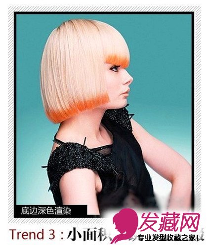 在大面积底色的基础上,选择小面积的对比色或是明显亮色、深色的点缀穿插,让枯燥的单色发型变得跳跃活泼起来。比如这种在刘海和短发的底边做深色渲染,为死板的直发BOB增加动感。