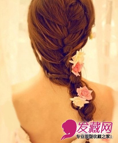 编发,从发顶慢慢编下的三股辫造型,佩戴点点碎花,精致唯美。