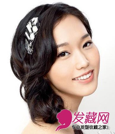 这款松垮的辫子发型极具女性魅力。将头发全拨到一侧,编织一个松松垮垮的辫子,发尾处编得紧密一些,松紧相结合,充满甜美浪漫气息。再搭配一个镶钻发饰,女人味十足。