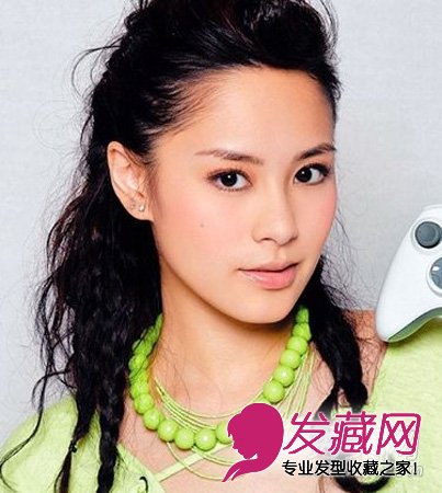 将刘海向后高高挽起,露出饱满的额头和清丽秀气的小脸。同时,努力制造头发的蓬松感和纹理感。最后,在头发的发尾处编织几条小辫子,让发型显得搞怪又不失可爱气质。