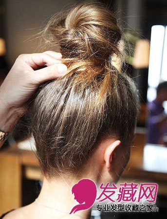 之后把辫子和碎头发一起盘起形成一个圆发髻再打松发尾处。