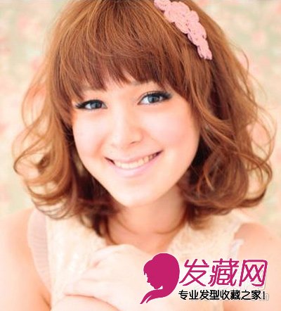 卷的幅度比前几款都要大,从耳际就开始卷起了,齐刘海跟棕黄色更加使得这款发型变 甜美可爱起来。