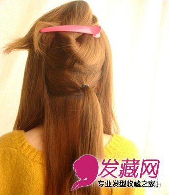 长发发型扎法步骤4:把头顶头发放下,梳子梳好,抓起后由左至右旋钮一圈。