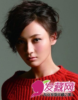 经过烫发处理的长发,随性盘起一个蓬松的盘发造型,蓬松的发丝凸显出盘发的时尚气息,大片的斜刘海发型,增加了盘发造型的清新时尚感,搭配大红色的针织衫,显得尤为优雅复古。