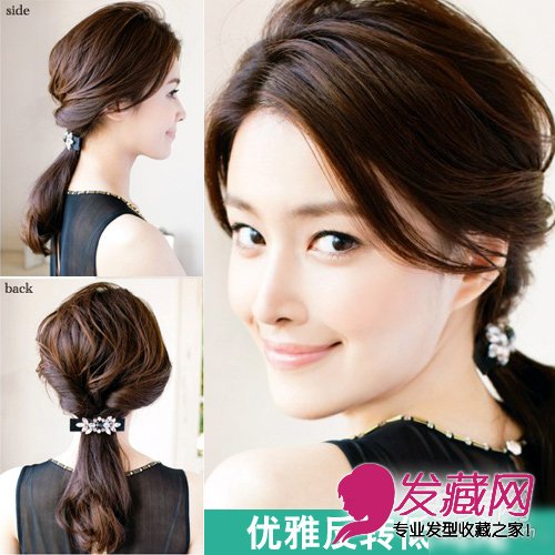传统的低马尾很容易显得呆板,其实只要简单加一部,只要将马尾向里翻转一下,发型就很精致优雅了。