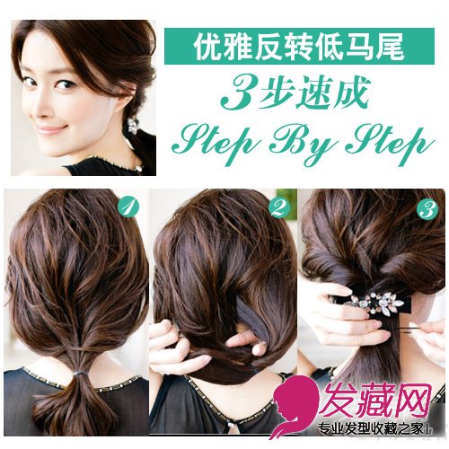 3、调整好反转后的马尾的造型,在皮筋处夹上华丽的钻饰发夹即可。