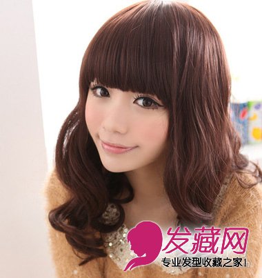 披肩的中长发梨花烫,可爱优雅,加入齐刘海搭配显可爱萝莉。栗色系的发色更显文静淑女!