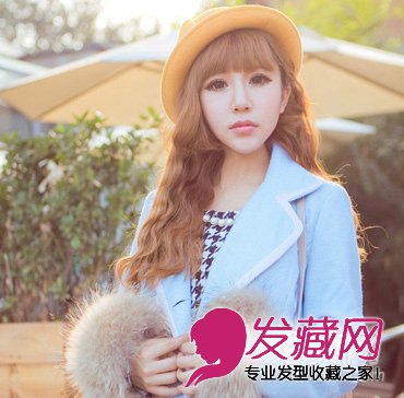 刘海剪齐粉嫩可爱,烫一款长发麦穗烫,随意披在肩上,浪漫优雅,染上奶茶系发色显朦胧萝莉。再加复古小礼帽搭配潮范尽显。准备剪齐刘海或