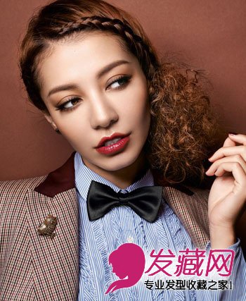 偏分的长发在脑后一侧扎成马尾,发梢被造型成蓬松的微卷发,长刘海则顺着发髻线编成三股辫,造型很有英伦女孩的风情。