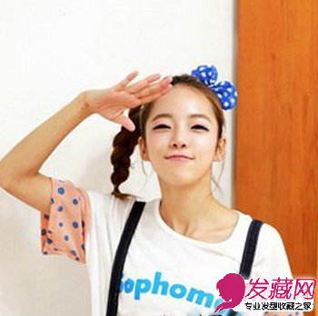 非常俏皮活泼的一款发型,斜扎的麻花辫垂在一肩,看上去都非常清凉,蓝色的蝴蝶结发饰彰显青春活力,加上敬礼的动作,精灵般惹人喜爱。