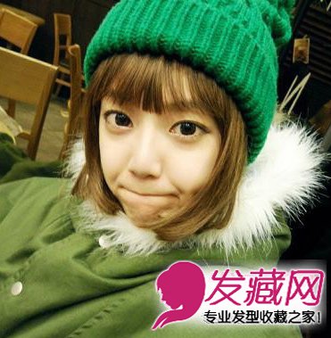 韩国少女萌味十足的齐刘海短发,加绿色毛线帽搭配更可爱萝莉呢