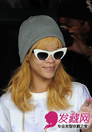 灰色毛线帽下,蓬松的金色齐刘海披肩发看起来厚实有质感。一款亮眼的白框墨镜造型夸张,富有张力的线条有效转移视线,将脸型衬托的更加完美。