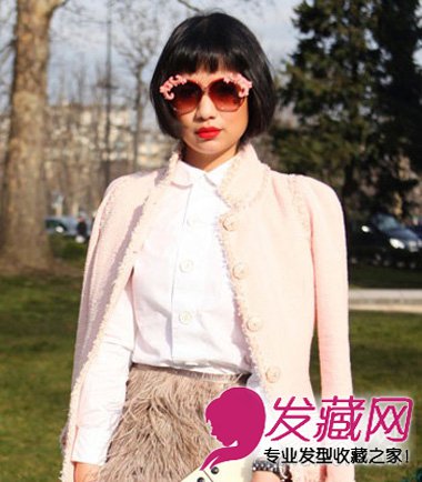 AnnaWintour款齐刘海Bob发干练中不失女性柔美,粉色系外套及皮草短裙的配搭更奠定高级定制风格。同色系的雕花墨镜成为王牌亮点。