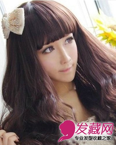 超甜美的大片长卷发,打造出一张极致的小脸型,厚感带点弧度的齐刘海呈现水灵的大眼效果,动感的卷发搭配蝴蝶结头饰,在清凉的秋季里又洋溢可爱芭比的小女生气息。