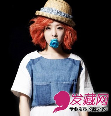 ,侧分的斜刘海发丝飘逸,搭配橘色染发时尚潮爆,很衬肤色的发色,搭配帽子,清新甜美的韩流范儿。